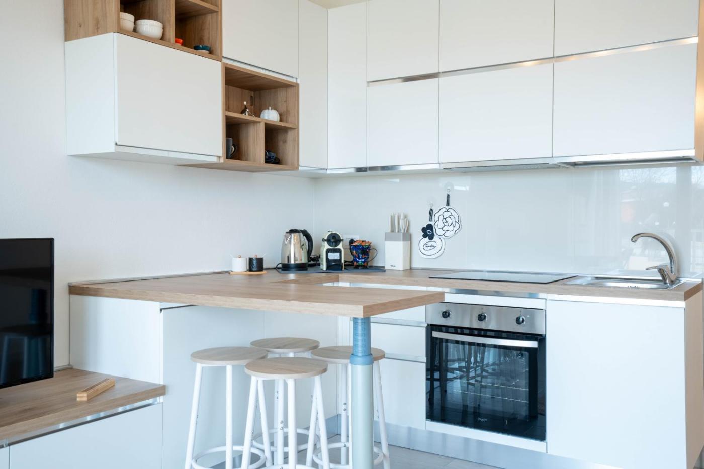 Two-Bedroom Apartment. Boasting a private entrance, this air-conditioned apartment comes with a kitchen, 2 bedrooms and 1 bathroom with a shower and a bidet. Meals can be prepared in the well-fitted kitchen, which features a stovetop, a refrigerator, kitchenware and an oven. The apartment has tiled floors, a seating area with a flat-screen TV, a washing machine, a tea and coffee maker as well as pool views. The unit has 2 beds.